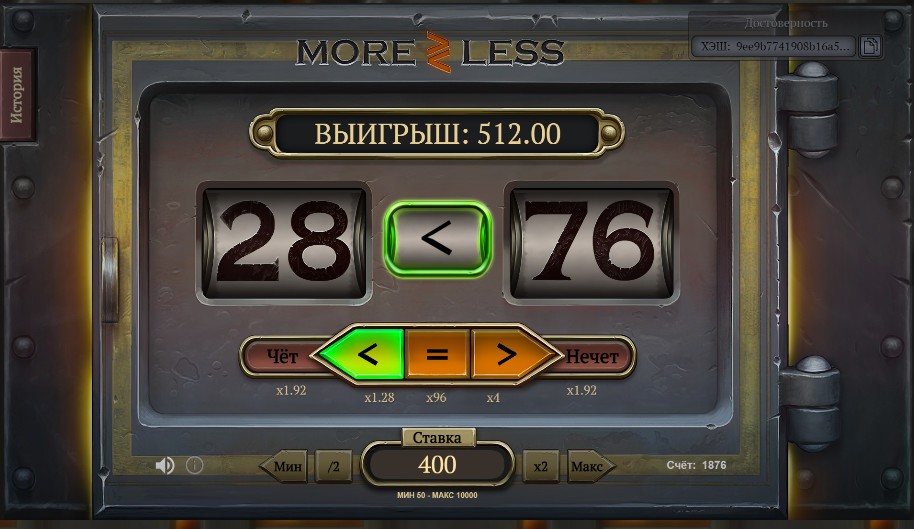 Правила игры «Больше Меньше» легче всего объяснить на примере. Возьмём случайное число из 100, пусть это будет 20. Теперь делаем предположение о том каким будет следующее число (напомню, что оно будет выдано генератором случайных чисел). Логично предположить, что чисел от 20 до 100 значительно больше чем от 0 до 20, что даёт ставке БОЛЬШЕ лучшие шансы на выигрыш. Но и коэффициент в случае выигрыша будет не таким существенным, каким он мог бы быть если бы вы сделали ставку МЕНЬШЕ и победили.