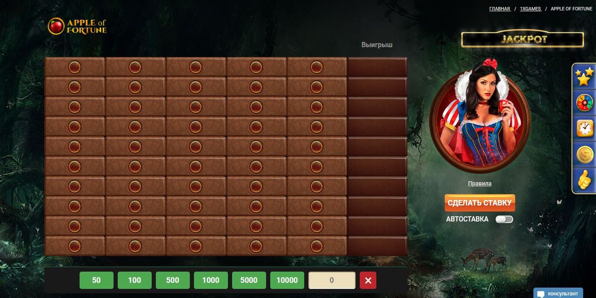 Основной сайт для игры в Яблоко Фортуны, так как именно здесь зародилась эта игра. Она находится в разделе с играми 1xGames и занимает одно из верхних мест среди более чем 100 игр на деньги. Это не удивительно, потому что Яблоко Фортуны является приоритетным выбором большинства пользователей. Играть в Apple of Fortune можно в очень широком диапазоне ставок от 10 рублей до 25000 рублей за партию. И это не плохая возможность поэкспериментировать со ставкой, подбирая себе игровую стратегию.